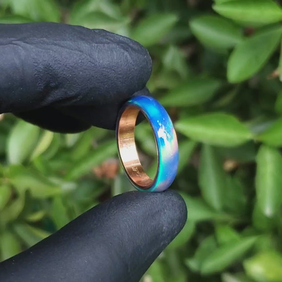 Confeccionado en ópalo azul, este anillo destaca por sus tonos profundos y reflejos luminosos que reaccionan a la luz, de tonos amarillos a morados revelan matices cambiantes llenos de vida. Su núcleo metálico aporta estructura y equilibrio al diseño, además de permitir personalización según cada historia.