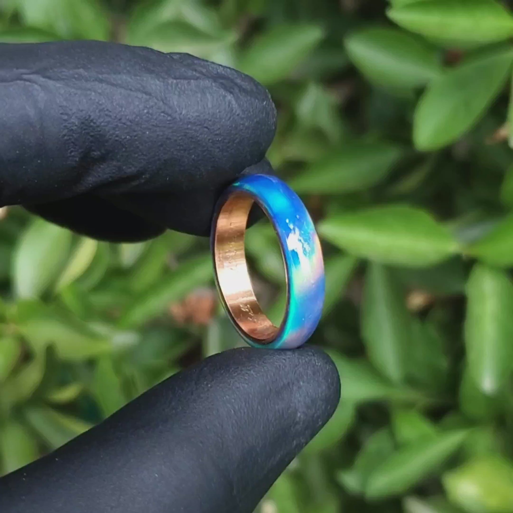 Crafted in blue opal, this ring stands out for its deep tones and luminous reflections that react to light, revealing shifting hues from yellow to purple, full of life and depth. Its metal core provides structure and balance to the design, while also allowing for personalization according to each story.