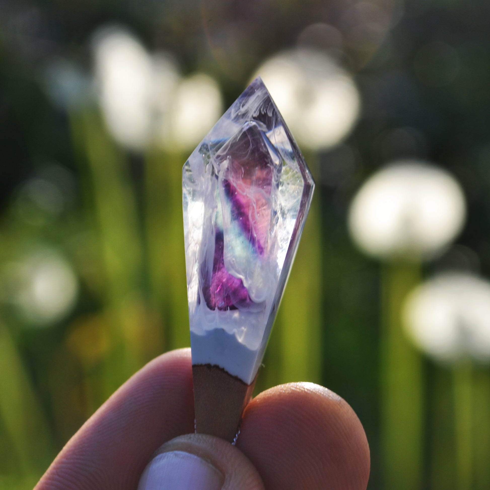 -Colgante hecho a mano en madera de roble y dos tipos de resinas, transparente y blanca con efecto marmoleado. Lleva una piedra fluorita encapsulada.