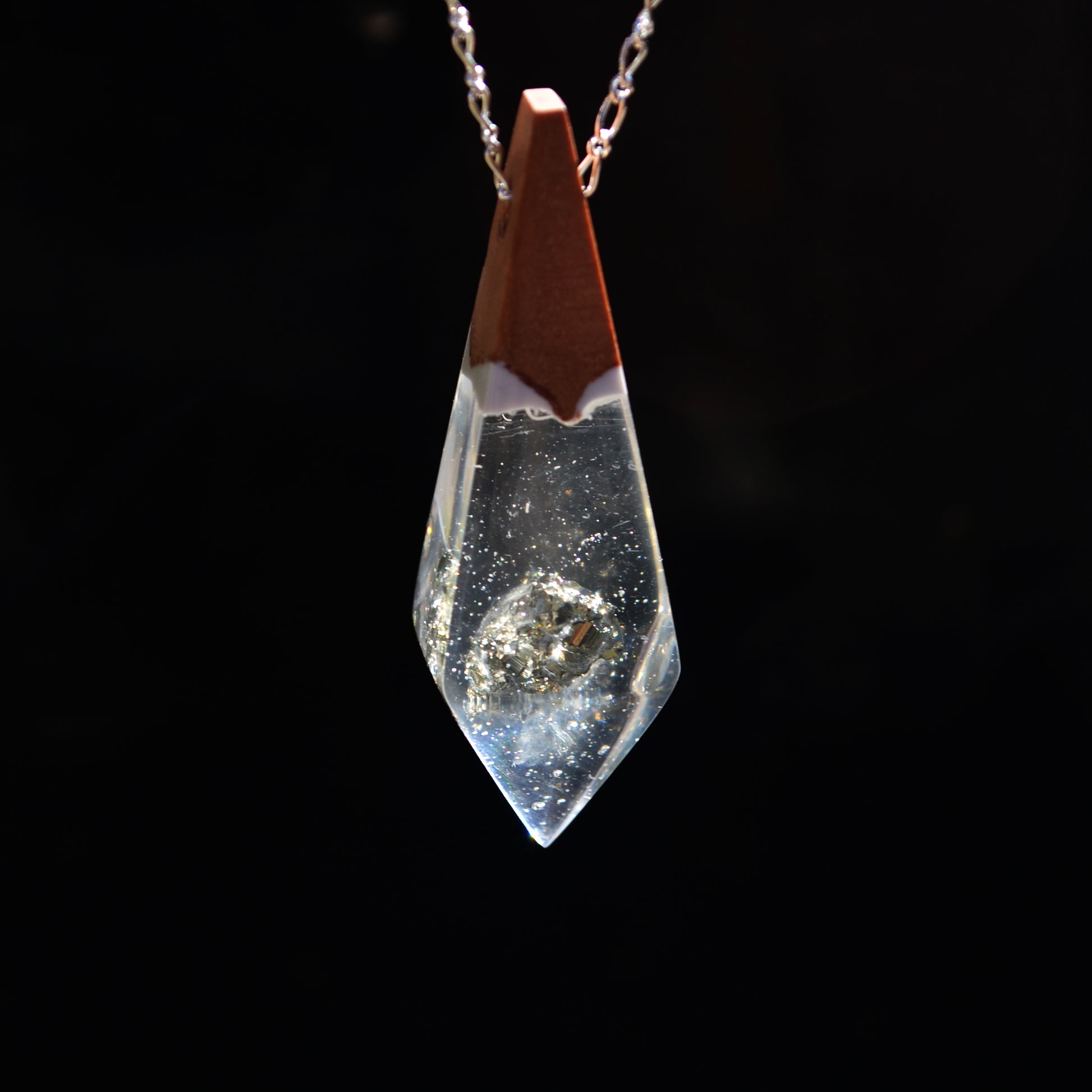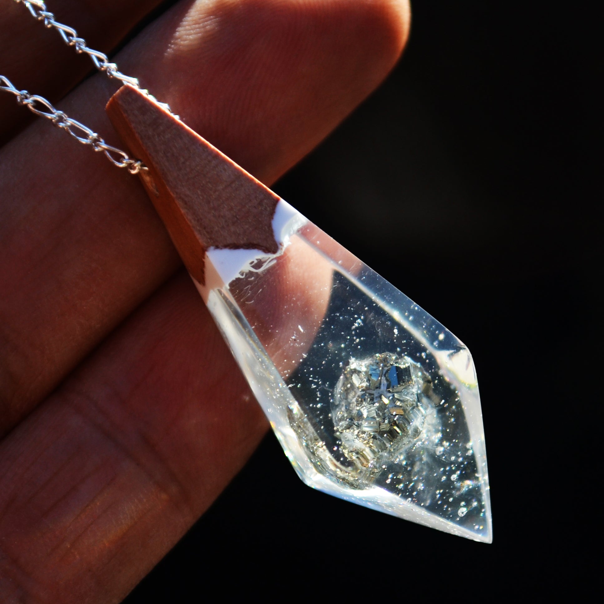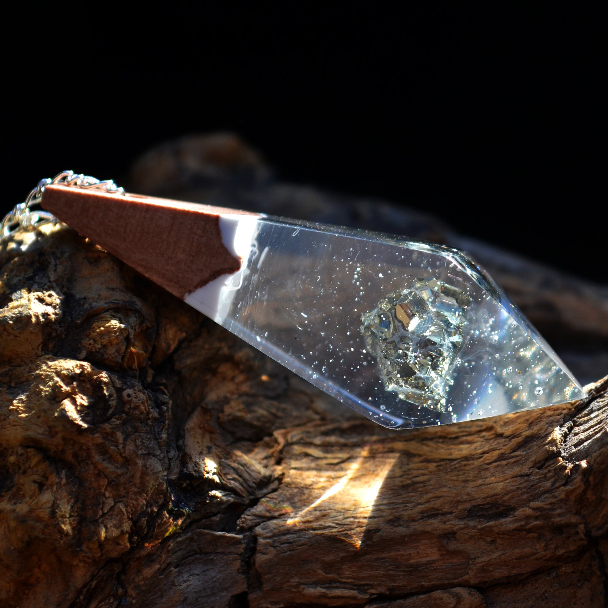 - Colgante hecho a mano en madera de roble, 2 tipos de resinas y una pirita encapsulada, una piedra muy positiva, facilita el contacto con las propias habilidades, estimulando el flujo de energía. Acelera también la actividad mental, así como la memoria y el recuerdo.
